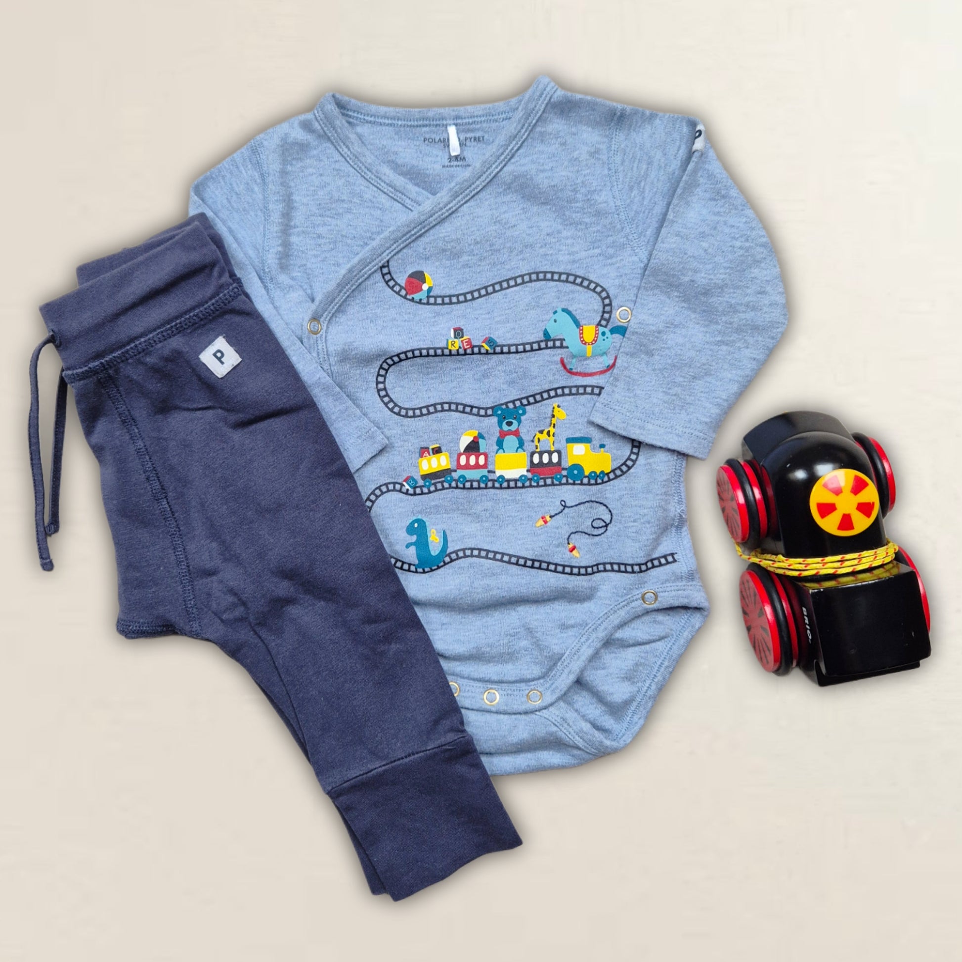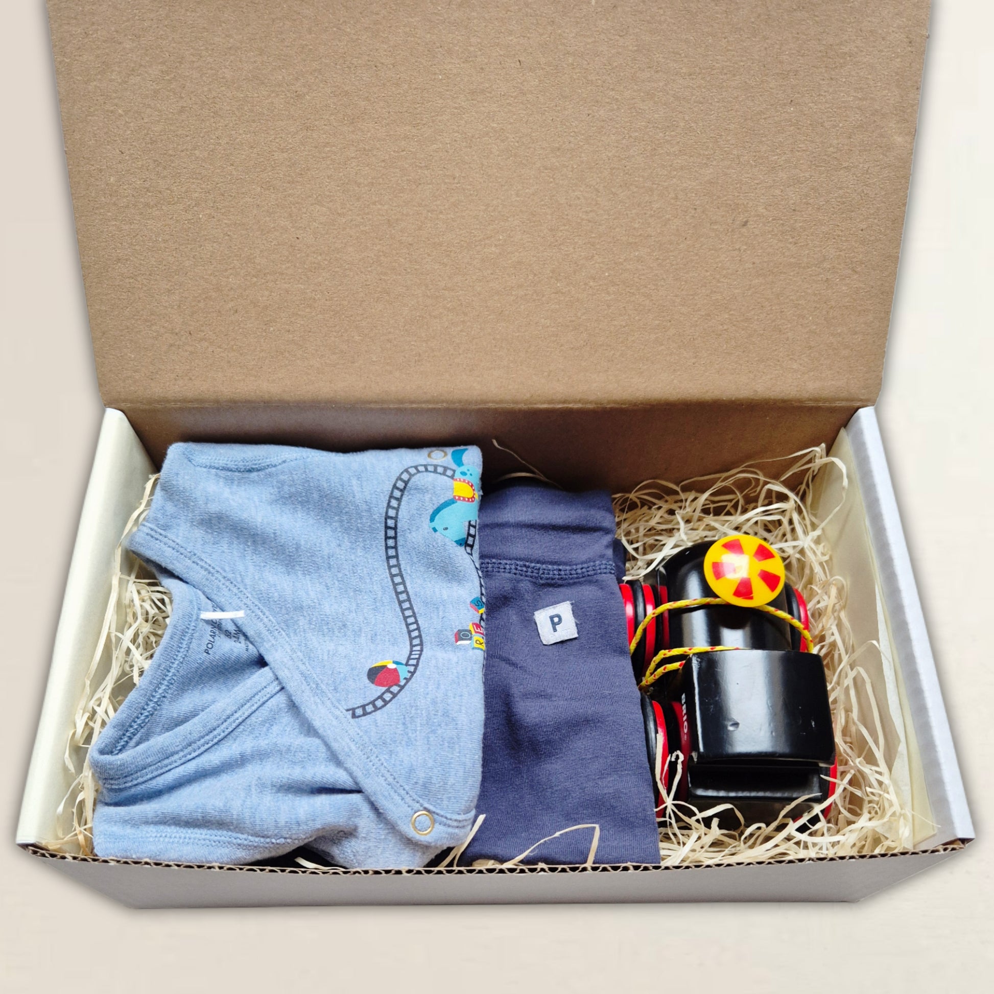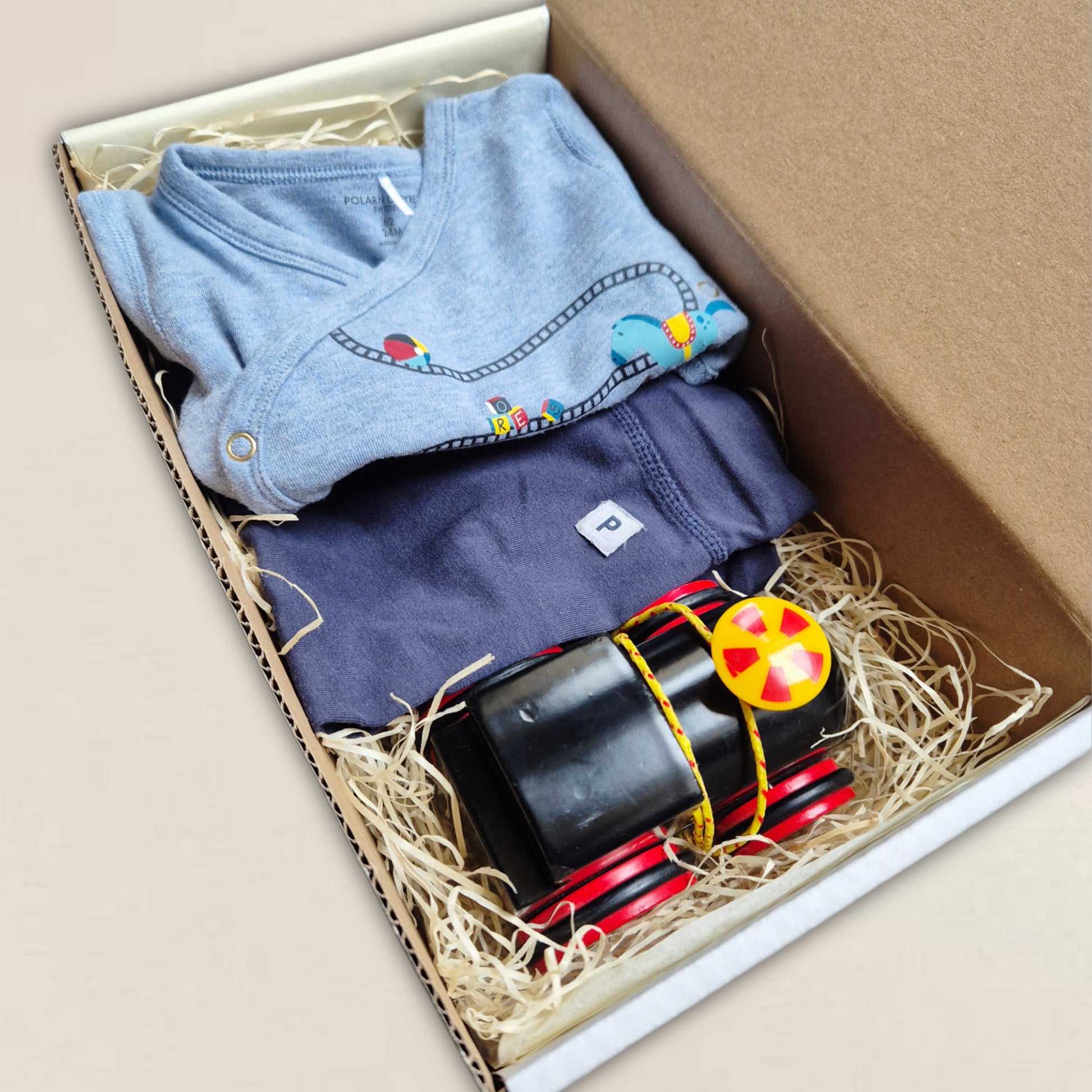 Lekfullt paket med kläder från Polarn o Pyret tillsammans med en klassisk dragleksak från Brio.