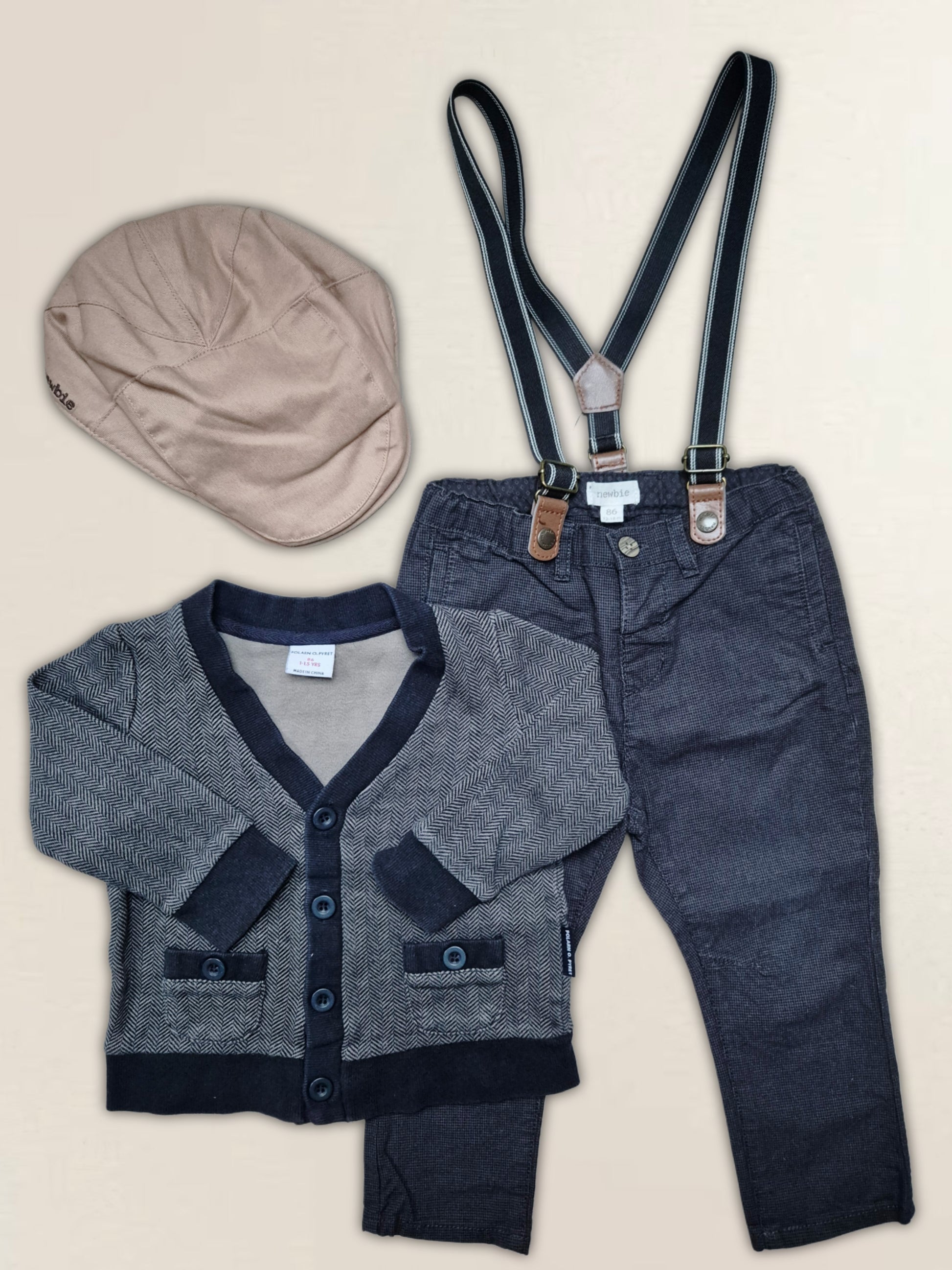 Det perfekta klädsetet med hängselbyxor, kofta och basker. Hängselbyxorna från Newbie är både stiliga och bekväma.