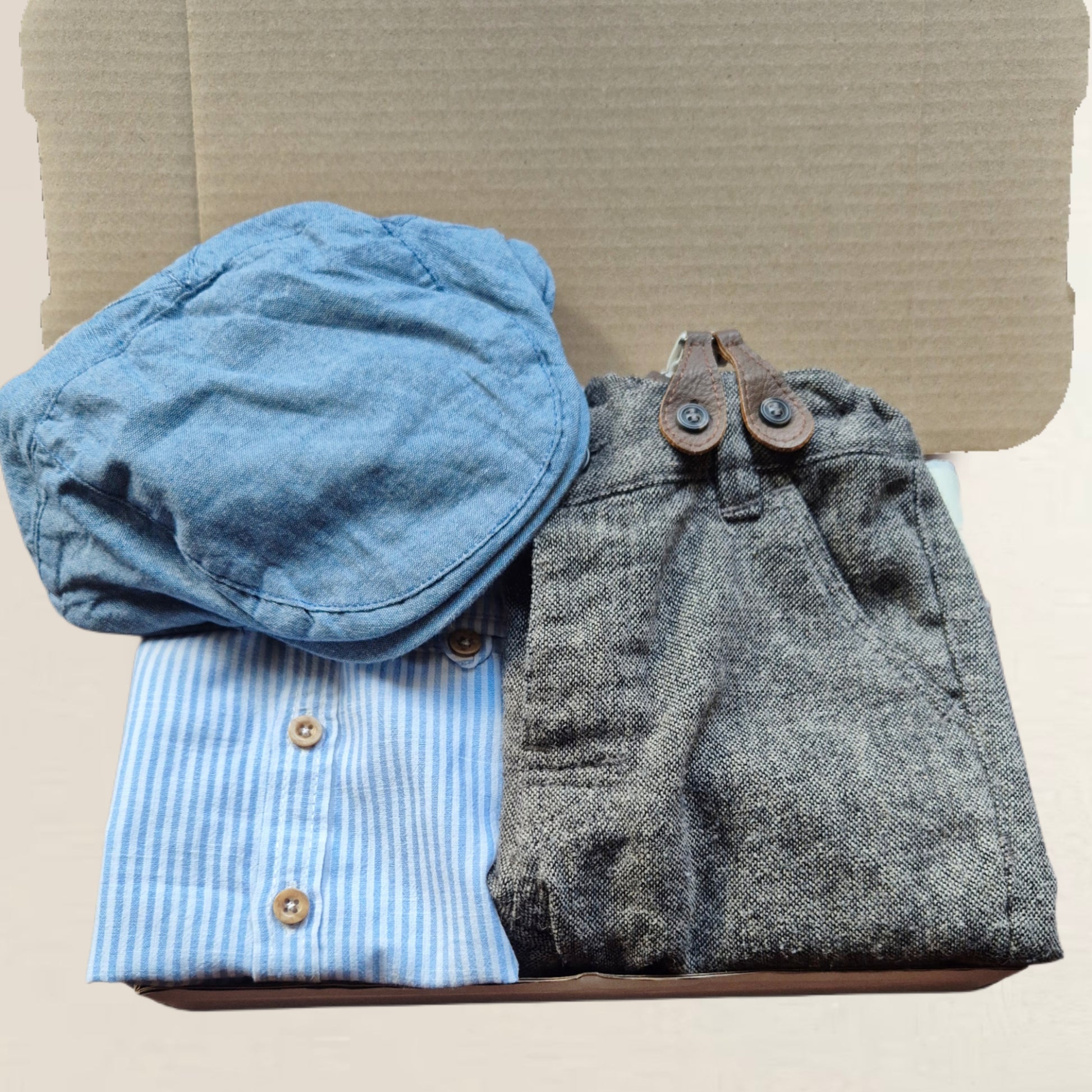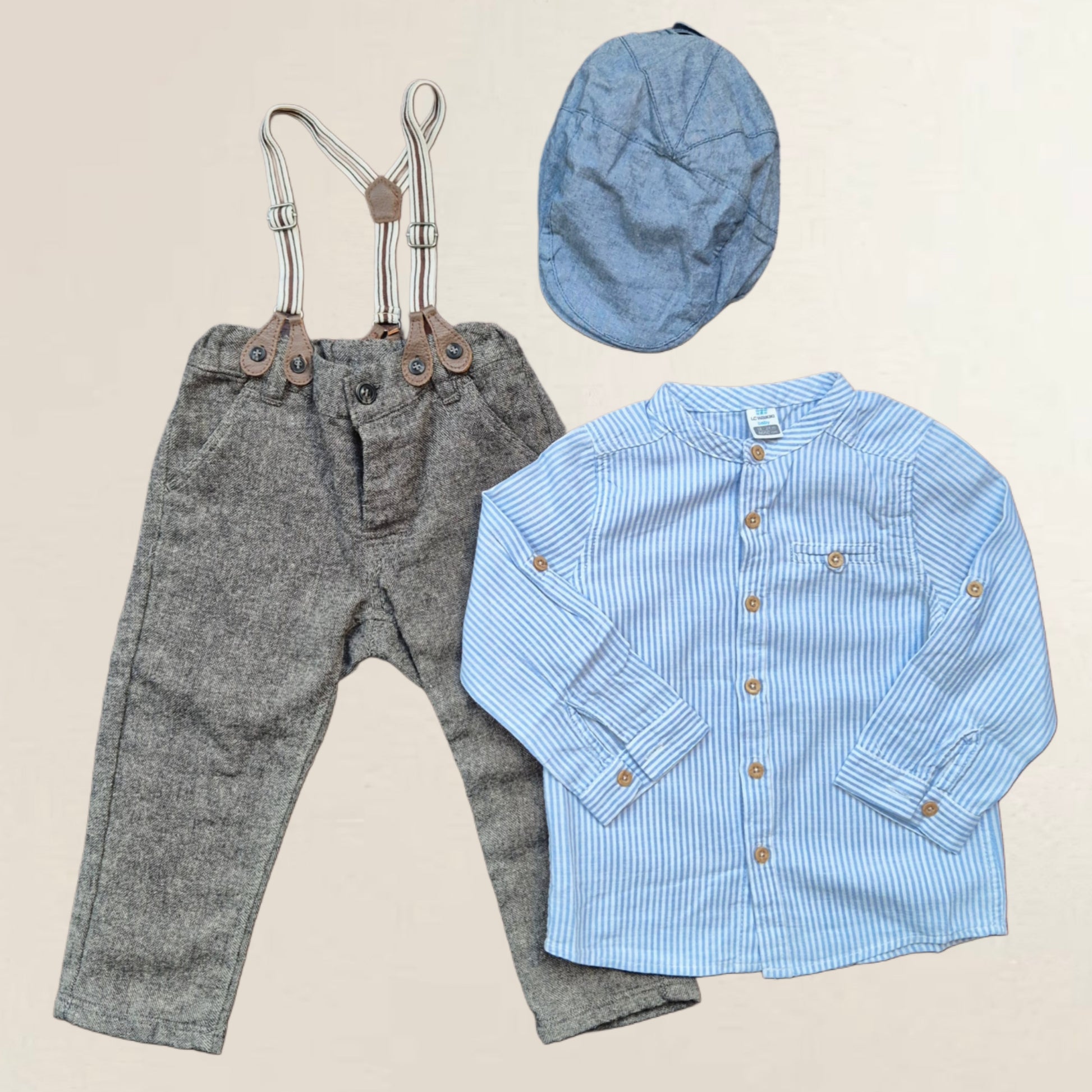 Hängselbyxor, skjorta, basker. Strl. 86