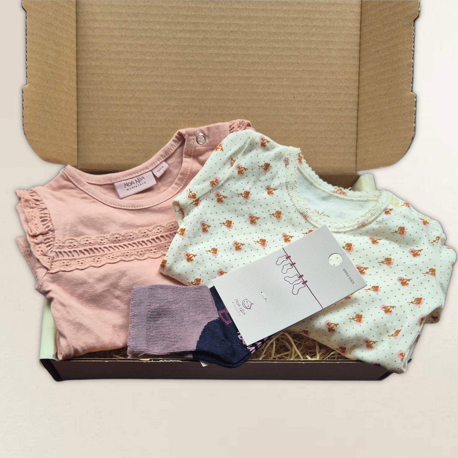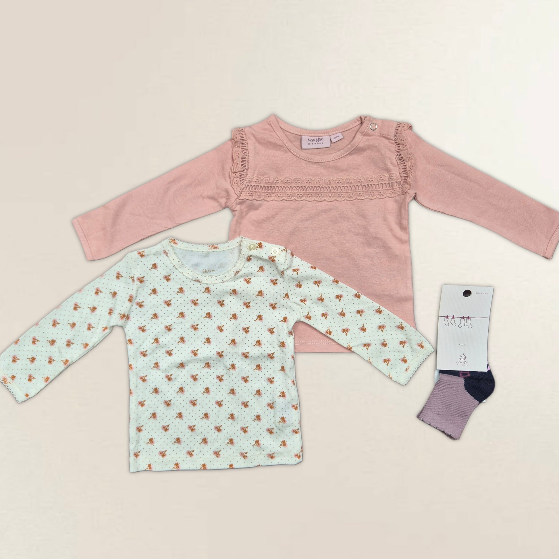 Med en rosa och en vit tröja från Noa Noa, erbjuder detta set både stil och komfort. Matchande strumpor medföljer som håller små fötter varma och bekväma. Detta set är idealiskt för både vardag och speciella tillfällen.